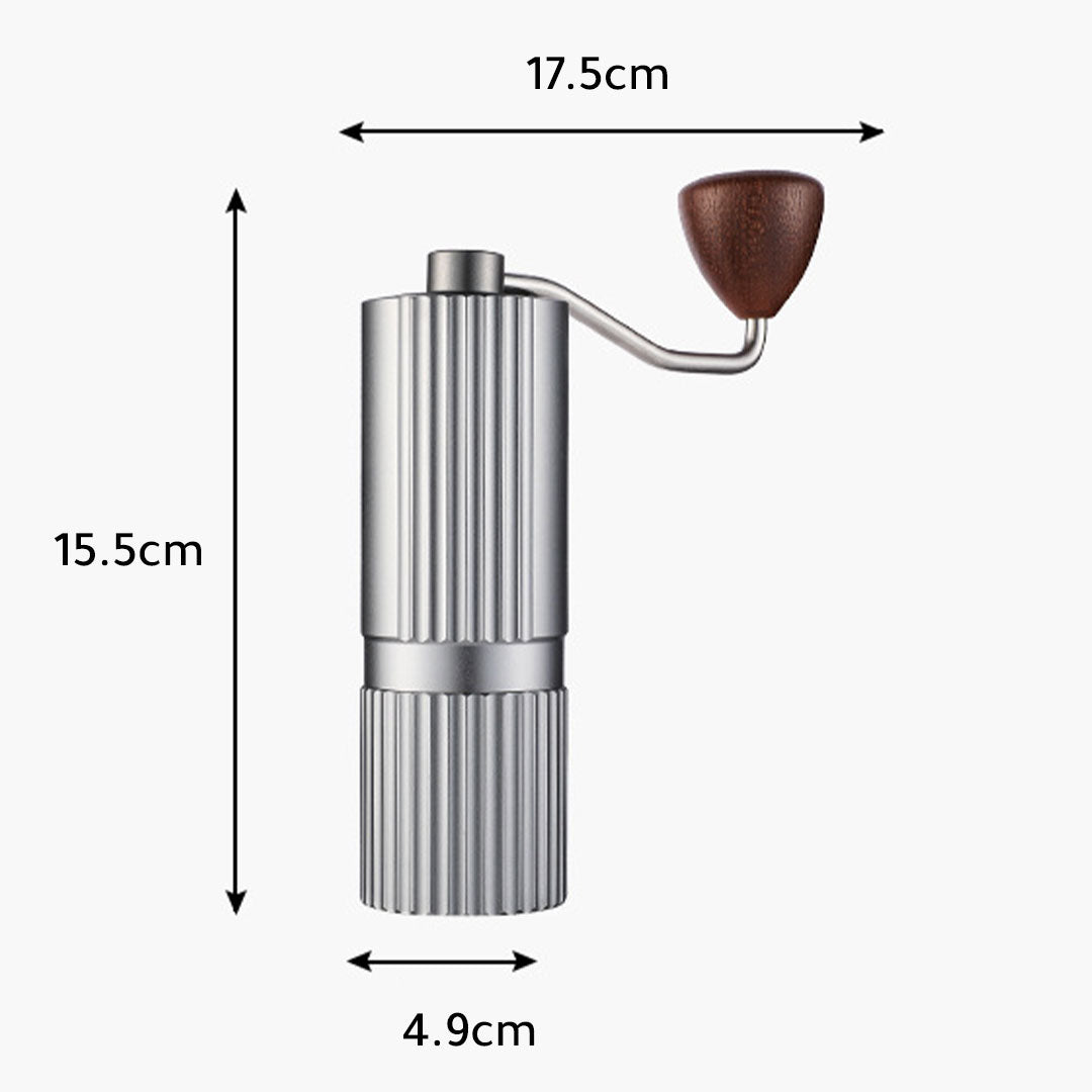 مطحنة ميبرو رمادية احترافية. مصممة لطحن دقيق للإسبريسو والقهوة المصبوبة، وتتميز بتروس متينة وإعدادات متعددة الأحجام.