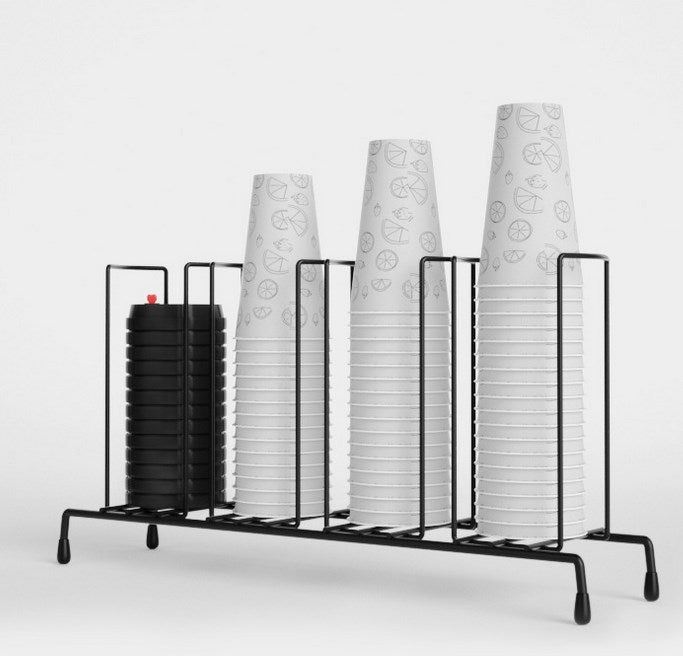 A sturdy black metal cup holder, perfect for commercial use in cafes to efficiently store and display numerous cups.