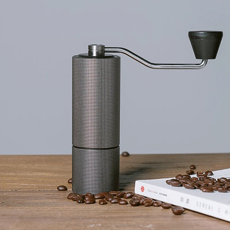The Timemore C2 Manual Coffee Grinder in grey. A popular choice known for its affordability, quality steel burrs, and consistent grind for filter coffee.